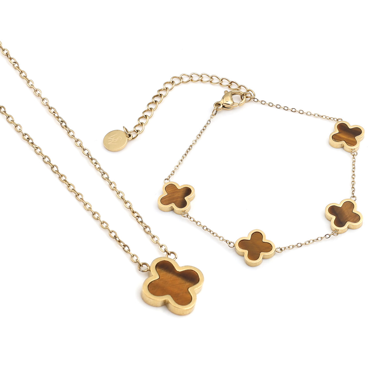 Each piece is plated in radiant yellow gold and features tiger eye crystals, known for their grounding energy, confidence-boosting qualities, and protective properties. The necklace showcases a single clover pendant, while the bracelet is adorned with four matching clover charms, each beautifully embedded with tiger eye for a cohesive, powerful look.