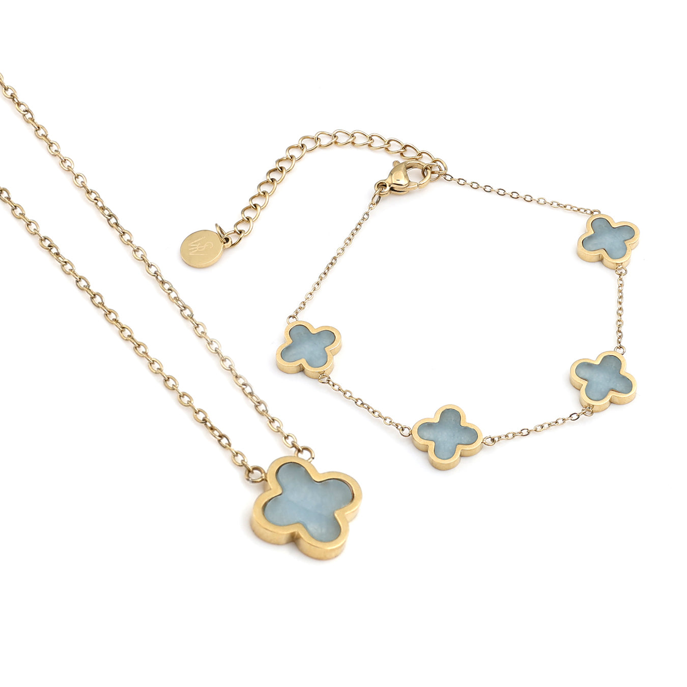 Each piece is plated in radiant yellow gold for a luxurious finish. The necklace features a single clover pendant, elegantly set with a turquoise crystal known for its calming and protective properties. The bracelet showcases four matching clover charms, each embedded with a turquoise crystal, creating a cohesive and eye-catching design.